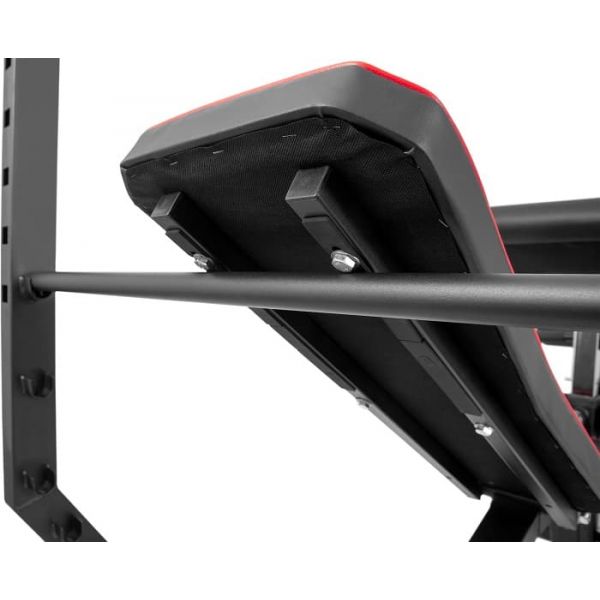 Με το σύστημα εκγύμνασης ποδιών μπορείτε να γυμνάσετε τετρακεφάλους (με το κάτων σετ μαξιλαριών) ή τους μηριαίους δικεφάλους (με το άνω σετ μαξιλαριών). Φορτώστε την ειδική υποδοχή δίσκους (έως 45 κιλά) τόσο διαμέτρου O28mm όσο και O50mm (Ολυμπιακού τύπου)