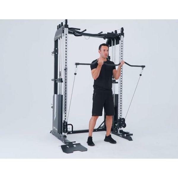 Διαθέτει ρυθμιζόμενη τροχαλία, με δυνατότητες περιστροφής 180 μοιρών και ρύθμισης σε 21 θέσεις, ενσωματωμένα μεταλλικά βάρη 180kg, μονόζυγο καθώς και αποθηκευτικό χώρο για μπάρες και στις δύο πλευρές, για εύκολη αποθήκευση και επιλογή.