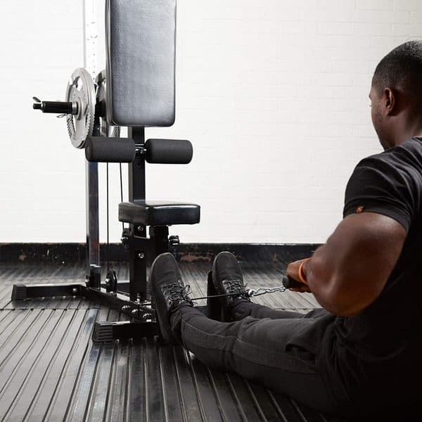 - Διαθέτει μεταλλική αναδιπλούμενη κόντρα πελμάτων για την σωστή εκτέλεση της χαμηλής κωπηλατικής αλλά και μαξιλάρια – κόντρες στο άνω μέρος των μηρών για να μην σηκώνονται στις έλξεις υψηλής τροχαλίας.