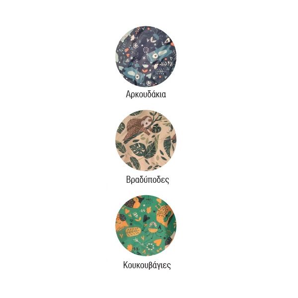 Χρώματα: Μπλε, Γαλάζιο, Πορτοκαλί, Λαχανί, Αρκουδάκια, Κουκουβάγιες, Βραδύποδες