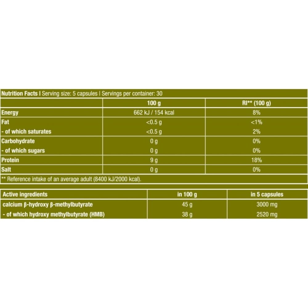 - 3000 mg β-υδροξυ β-μεθυλοβουτυρικού ασβεστίου, εκ των οποίων: 2520 mg β-υδροξυ β-μεθυλοβουτυρικού εστέρα (HMB)