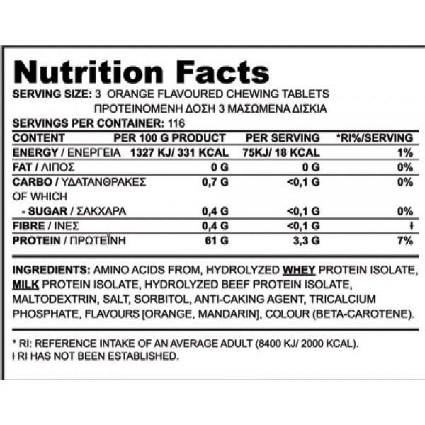 Προτεινόμενη δοσολογία: Σαν συμπλήρωμα διατροφής μπορείτε να πάρετε 3 ταμπλέτες πριν και μετά την προπόνηση και άλλες 3 πριν από κάποιο γεύμα
