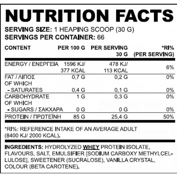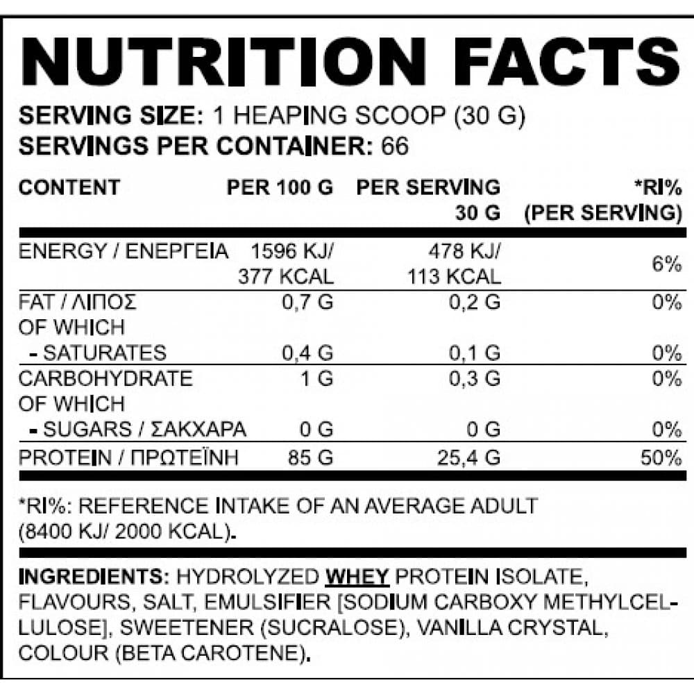 Η True Isolate είναι μία από τις καλύτερες πρωτεϊνες της αγοράς, γιατί περιέχει αποκλειστικά υδρολυμένο και απομονωμένο ορό γάλακτος που είναι η γρηγορότερα και καλύτερα αφομοιώσιμη πρωτεϊνική μορφή, ιδανική για άμεση αποκατάσταση μετά την άσκηση. Επιπλέον περιέχει πολύ μεγάλες δόσεις διακλαδισμένων αμινοξέων [BCAAs] και Γλουταμίνης που μειώνουν τον καταβολισμό και επιταχύνουν την πρωτεϊνοσύνθεση. Η True Isolate ξεχωρίζει και για την αγνότητα της καθώς δεν περιέχει καθόλου ζάχαρη, τρανς λιπαρά, λακτόζη και ασπαρτάμη.