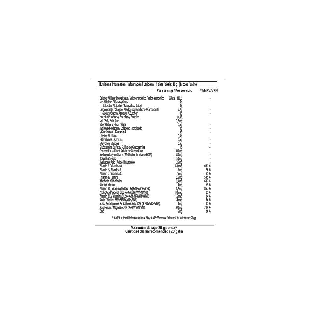 Συστατικά: Υδρολυμένο κολλαγόνο που έχει υποστεί ενζυμική εκχύλιση, αποβουτυρωμένη σκόνη κακάου 10-12% (Theobroma cacao, L.) *, Μικροποιημένη γλουταμίνη, L-Λυσίνη, L-Ορνιθίνη, L-Γλυκίνη, Θειική γλυκοζαμίνη λαχανικών, Θειική χονδροϊτίνη, Μεθυλοσουλφονυλομεθάνιο (MSM) Εκχυλίσματος Boswellia Serrata, υαλουρονικό οξύ, γλυκονικό μαγνήσιο, γεύσεις, λεκιθίνη σόγιας, βιταμίνη C (ασκορβικό οξύ), βιταμίνη Β3 (νιασίνη), γλυκονικό ψευδάργυρο, βιταμίνη Ε (οξική α-τοκοφερόλη), βιταμίνη Β5 (παντοθενικό οξύ) (Υδροχλωρική πυριδοξίνη), βιταμίνη Β2 (ριβοφλαβίνη), βιταμίνη Β1 (θειαμίνη), βιταμίνη Α (ρετινόλη), φυλλικό οξύ, βιοτίνη, γλυκαντικά: εκχύλισμα στέβιας.