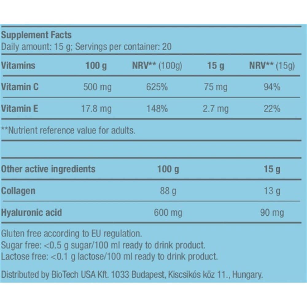 Το BioTechUSA Κολλαγόνο παρέχει πρακτικά υαλουρονικό οξύ και κολλαγόνο ταυτόχρονα. Περιέχει πρόσθετη βιταμίνη C που συμβάλλει στην παραγωγή κολλαγόνου του σώματος, η οποία τελικά συμβάλλει στη διατήρηση της υγείας του δέρματός σας, των αιμοφόρων αγγείων, των οστών, των χόνδρων, των δοντιών και των ούλων. Η περιεκτικότητα του προϊόντος σε βιταμίνη Ε παίζει σημαντικό ρόλο στην προστασία των κυττάρων από το οξειδωτικό στρες.